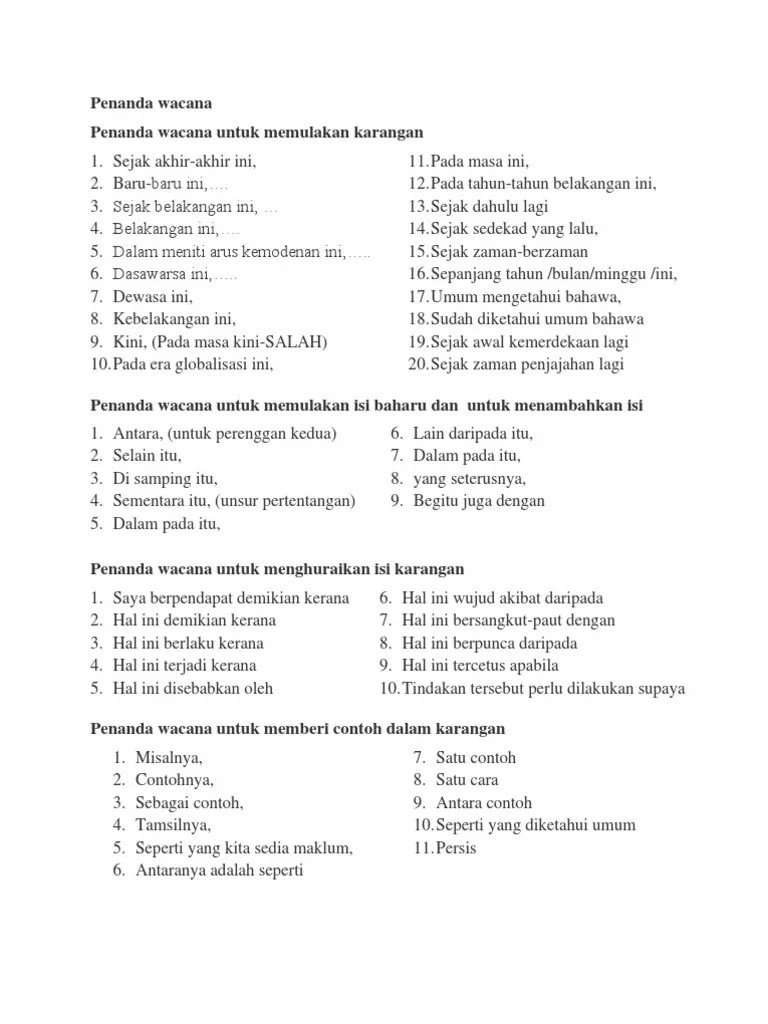 Dalam meniti arus kemodenan ini, 3. Lihat contoh penanda wacana di bawah ini sebagai panduan. Pada era globalisasi ini, 2. List of discourse markers (penanda wacana) adding (menambah. I) penanda wacana untuk memulakan karangan 1. 2.1.1 konsep bunyi (a) menyatakan definisi bidang fonetik dan 2.1.2 konsep fonem fonemik; 29.02.2020 · sjkc (sekolah jenis kebangsaan cina).